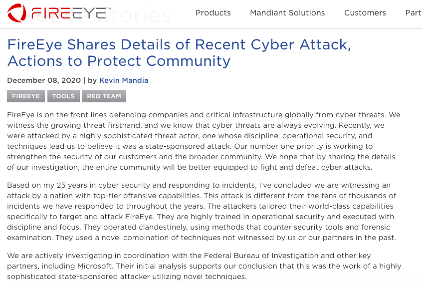“这次袭击与多年来应对的成千上万起攻击事件不同,攻击者量身定制了专门针对和攻击FireEye的技术工具,他们使用了我们或我们的合作伙伴过去从未见过的新颖技术组合。”Mandia继续解释道。
